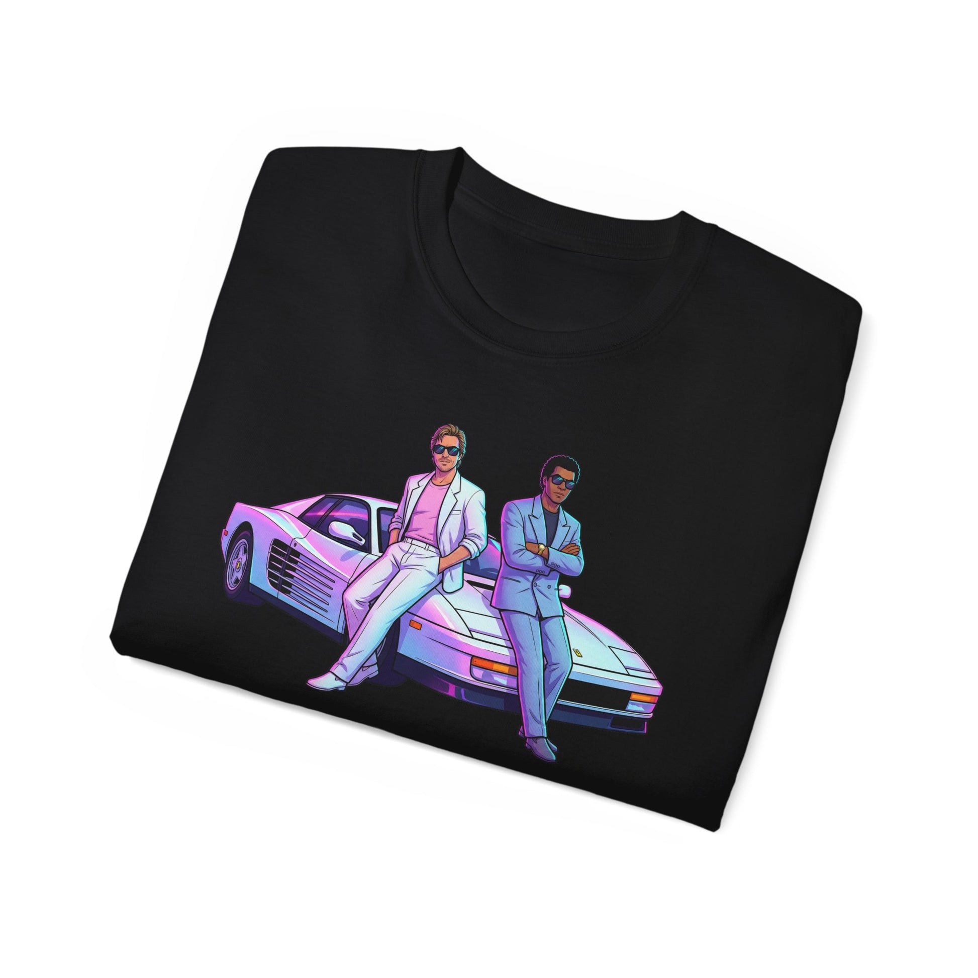 Inspired by the golden era of style and street confidence, the artwork captures two icons leaning back like time is on their side pastel suits, white Ferrari, and that unmistakable 80s cool. It’s not about chasing anything. It’s about already being there.