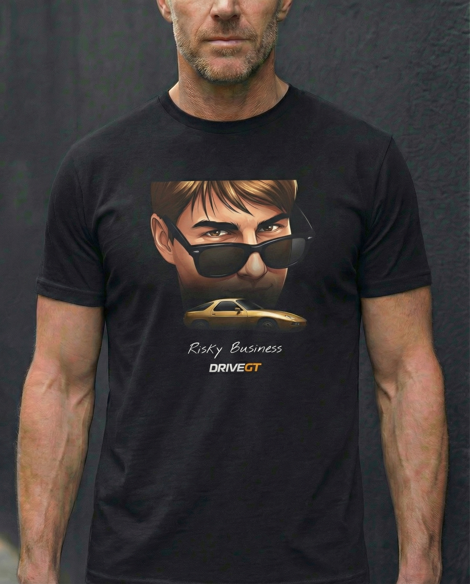 The Risky Business tee captures a defining moment of 1980s cool—reimagined through a cinematic cartoon lens. A knowing gaze peers over lowered sunglasses, while beneath it, a gold Porsche 928 emerges from the shadows. Power above. Desire below.